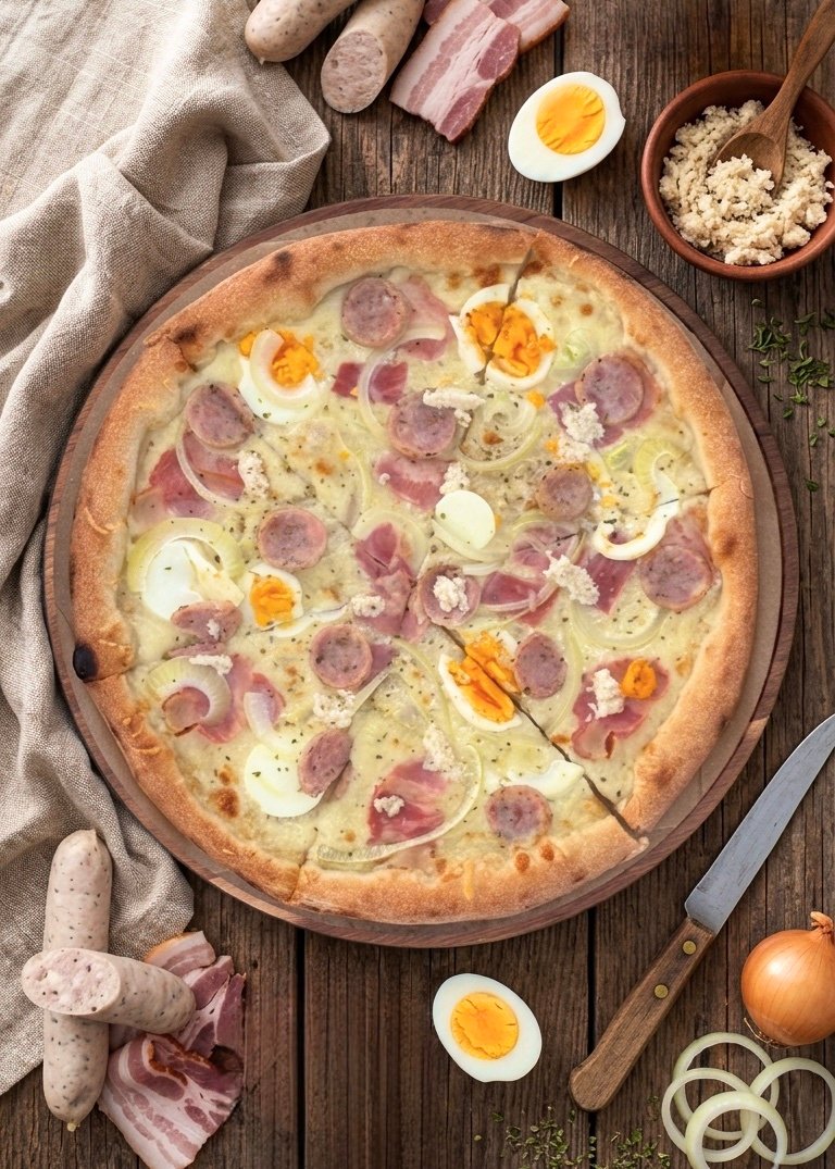 sos śmietanowy, ser, boczek, biała kiełbasa, jajko, cebula, chrzan, majeranek