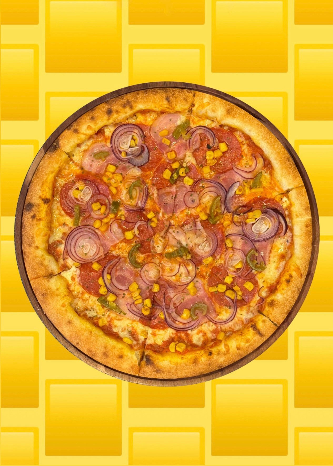 sos pomidorowy, ser,salami pikantne, boczek, kukurydza, jalapeno, czerwona cebula, oregano