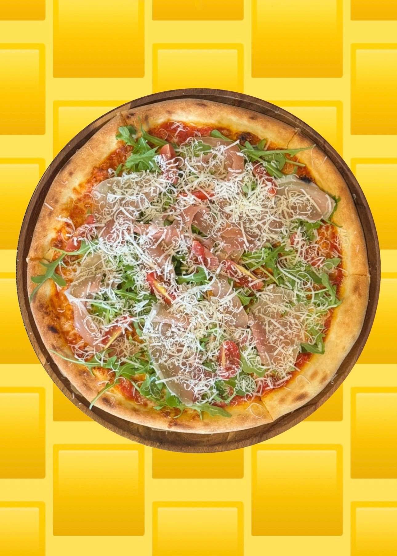 sos pomidorowy, ser, rukola, szynka parmenska, pomidor koktajlowy, parmezan