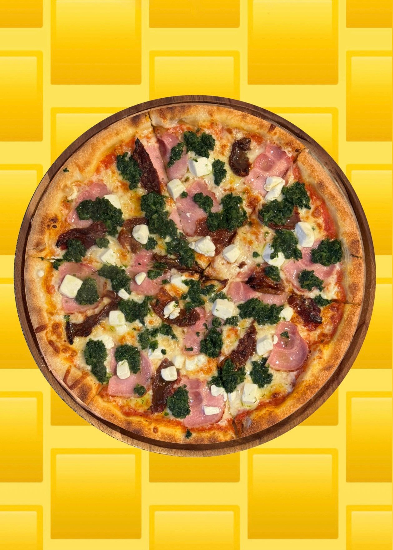 sos pomidorowy, ser, szpinak, boczek, feta,suszone pomidory, olej czosnkowy z ziolami